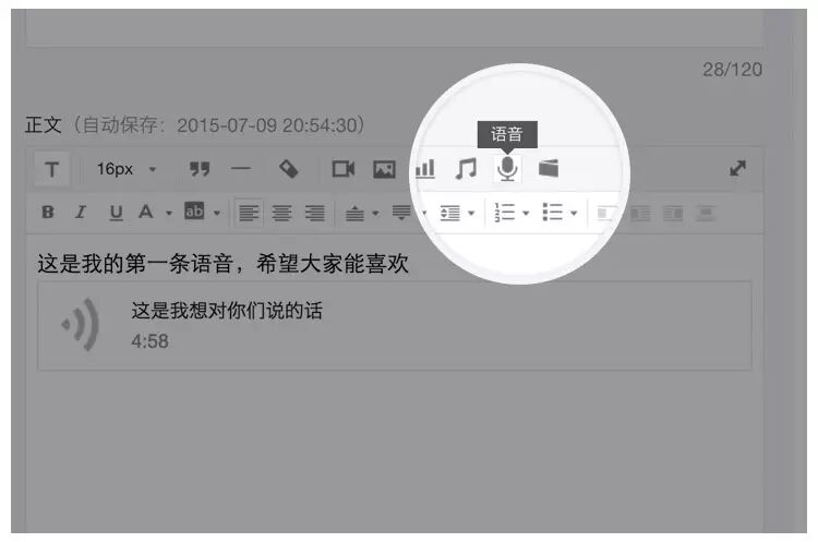 1. 运营者可以在编辑图文消息时,在正文中添加语音。一个图文消息支持添加一个语音。